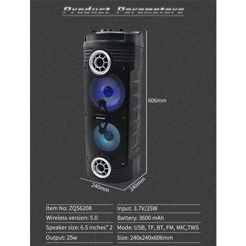 ZQS-6208 اسپیکر بلوتوثی پر قدرتی است که برای فضاهای بزرگ طراحی شده است. این اسپیکر امکانات فراوانی را دارا می باشد. قابلیت ضبط صدا در این اسپیکر تعبیه گشته است. می‌توانید پخش موسیقی را متناسب با فضا و موقعیت تنظیم کنید. اگر جزو افرادی هستید که علاقه به گرفتن مهمانی های بزرگ در خانه خود دارید این اسپیکر برای شما ساخته شده است. اسپیکر بلوتوثی ZQS-6208 شما میتوانید آن را به آسانی به هرگوشه از منزل منتقل نمایید و یا آن را به مهمانی دوستانتان ببرید. حتما شما هم در تلفن همراهتان لیستی از موزیک های مورد علاقه تان دارید با قابلیت بلوتوث میتوانید گوشی خود را به اسپیکر وصل کنید و موسیقی های مورد علاقه خود را پخش کنید. اسپیکر ZQS-6208 همچنین کارت TF , فلش مموری را پشتیبانی می کند.،با میکروفون که همراه اسپیکر قرار دارد می توانید تمرین خوانندگی کنید. همچنین با این اسپیکر میتوانید به کانال رادیویی مورد علاقه خود گوش فرا دهید. دارای امکان متصل شدن به دستگاه سری خودش TWS میباشد دارای ورودی میکروفون، میکروفون ، دارای حال های نورپردازی زیبا ، دارای حالت TWS (اتصال دو اسپیکر همزمان )، تغییر حالت نور همراه با موزیک است.