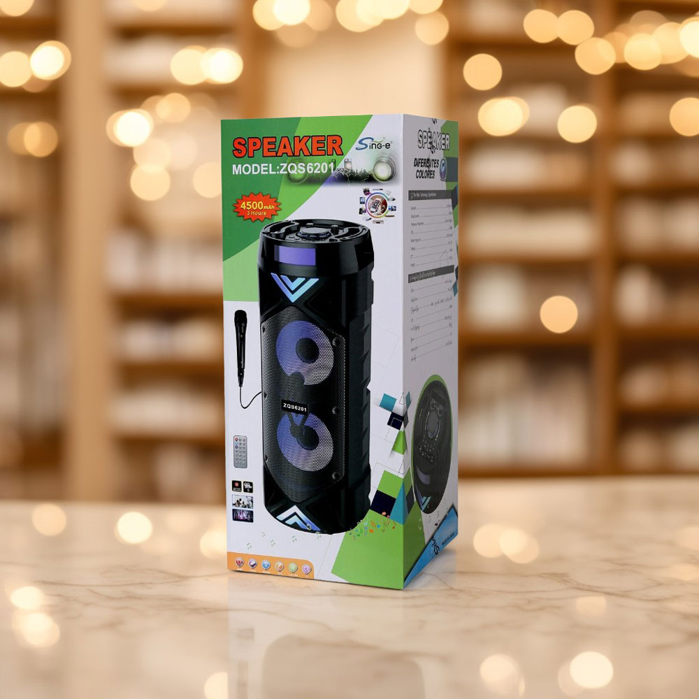 اسپیکر ZQS‑6203 علاوه بر اتصال بلوتوث، ورودی AUX، پورت USB و شیار کارت حافظه هم داره؛ یعنی حتی وقتی اینترنت یا گوشیات دم دست نیست، با یه فلش یا کارت مموری میتونی آهنگاتو پخش کنی. باتری قابل شارژ این مدل هم خیلی دوام میاره و برای چندین ساعت پخش مداوم جواب میده. به خاطر طراحی دستهدار و وزن مناسبش، خیلی راحت میتونی توی سفر، پیکنیک یا مهمونی همراهت ببری.